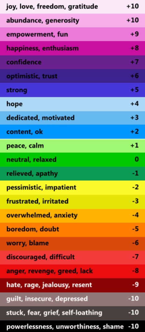 Vibrational Chart: Some context into why we are obsessed with keeping the vibration high. It’s a good chart to see where you are at with your emotions and then you can work on shifting them higher. I will discuss this in depth on the podcast.